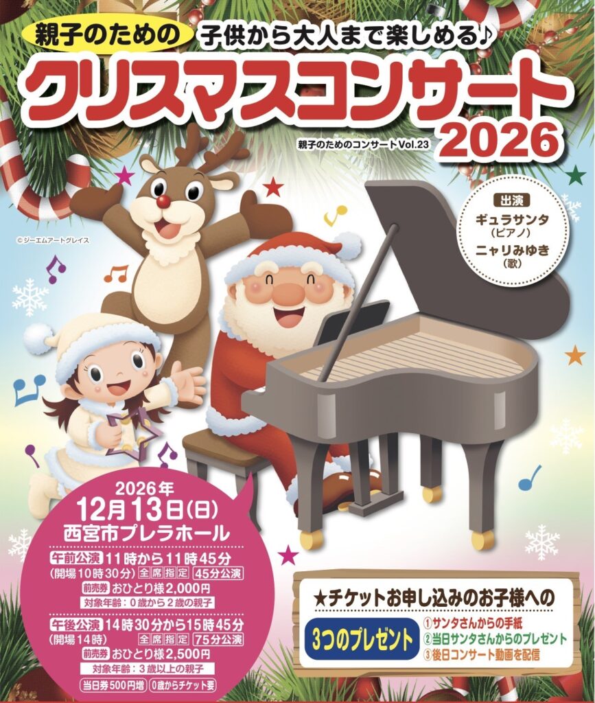 2026年12月13日(日)西宮市プレラホール(兵庫県)で開催される親子のためのクリスマスコンサート2026に出演するみゆきお姉さんの歌のパートナー子役(小学生)を1名募集します。
